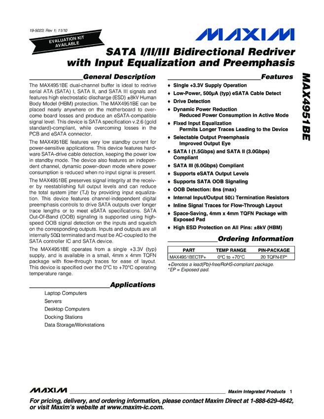 MAX4951BE SATA I/II/III Bidirectional Redriver with Input Equalization and Preemphasis