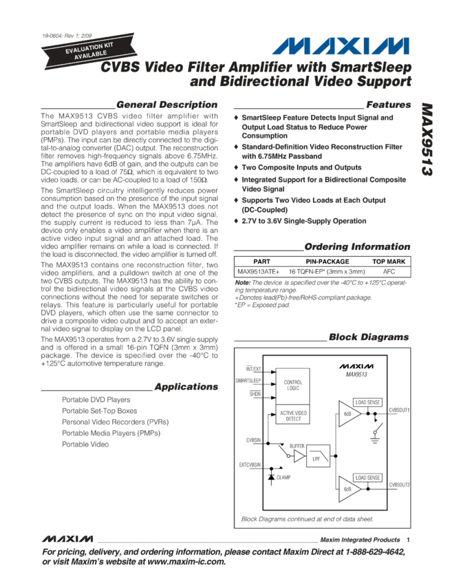 MAX9513 CVBS Video Filter Amplifier with SmartSleep and Bidirectional Video Support