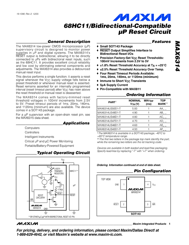 MAX6314 68HC11/Bidirectional-Compatible µP Reset Circuit