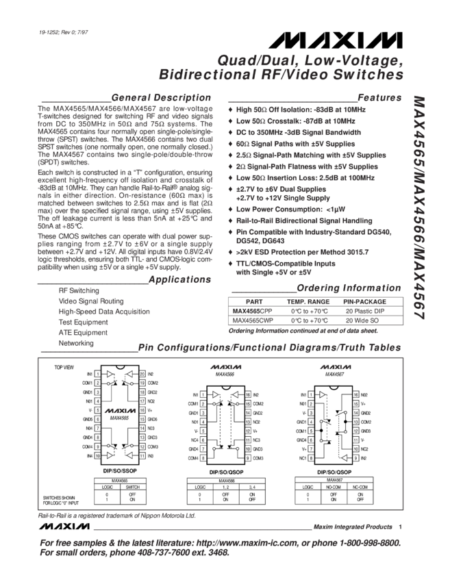 MAX4565, MAX4566, MAX4567 Quad Dual, Low-Voltage, Bidirectional RF Video Switches