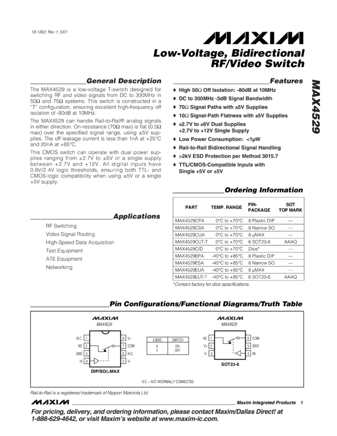 MAX4529 Low-Voltage, Bidirectional RF Video Switch