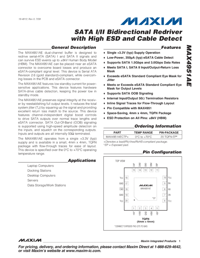 MAX4951AE SATA I/II Bidirectional Redriver with High ESD and Cable Detect