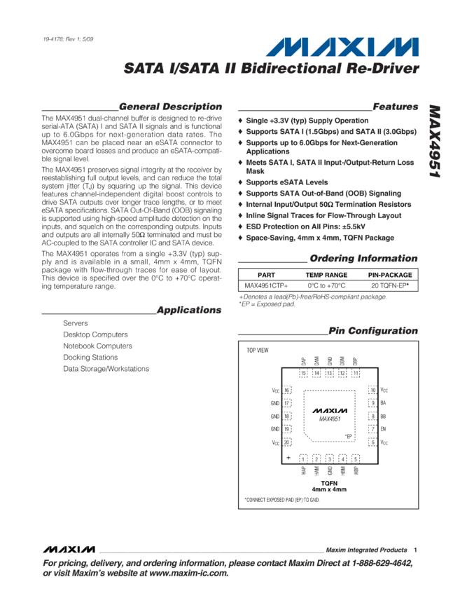 MAX4951 SATA I/SATA II Bidirectional Re-Driver