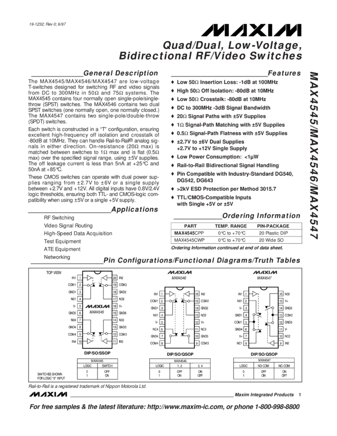 MAX4545, MAX4546, MAX4547 Quad/Dual, Low-Voltage, Bidirectional RF Video Switches