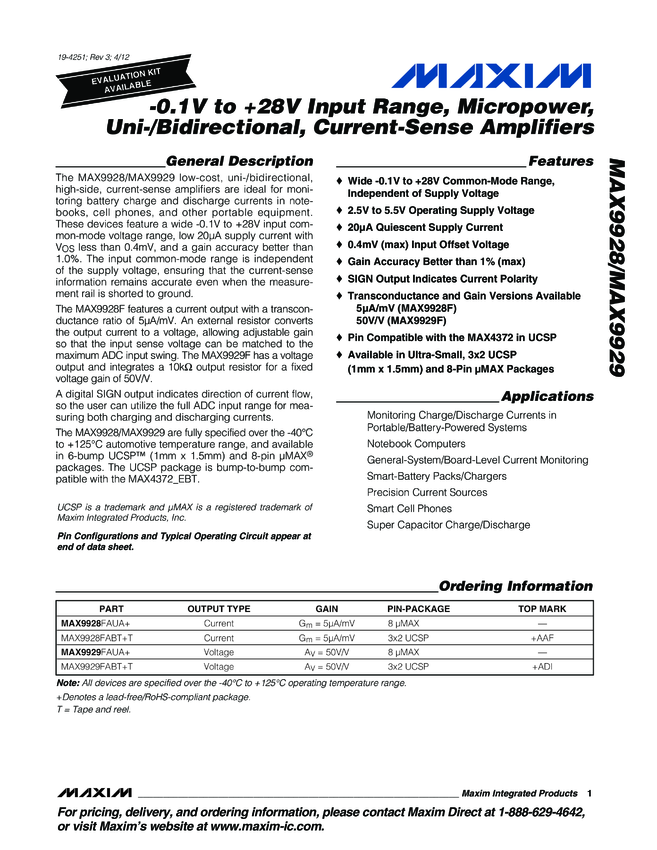 MAX9928, MAX9929 -0.1V to +28V Input Range, Micropower, Uni-/Bidirectional, Current-Sense Amplifiers