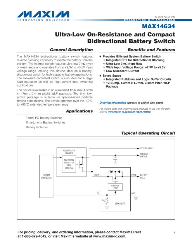MAX14634 Ultra-Low On-Resistance and Compact Bidirectional Battery Switch