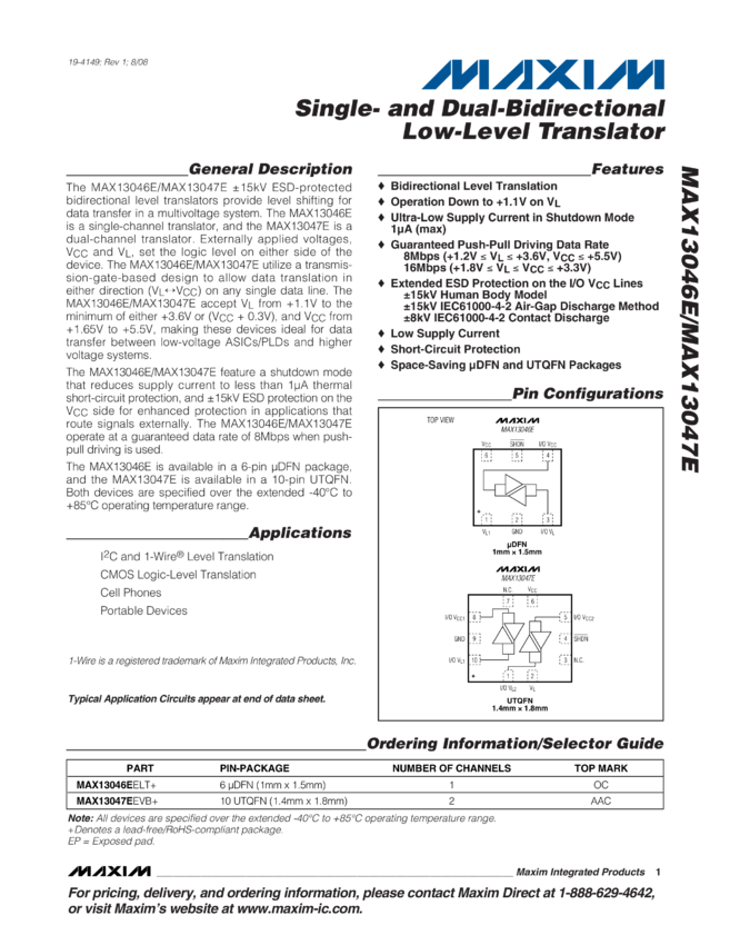 MAX13046E, MAX13047E Single- and Dual-Channel, Bidirectional Low-Level Translators