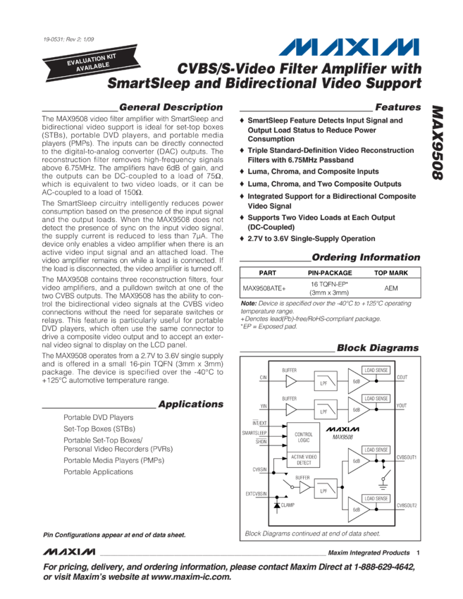 MAX9508 Video Filter Amplifier with SmartSleep and Bidirectional Video Support