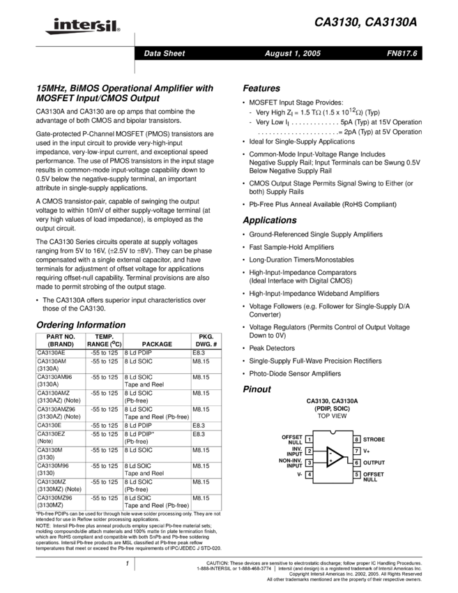 15MHz, BiMOS Operational Amplifier with MOSFET Input/CMOS Output