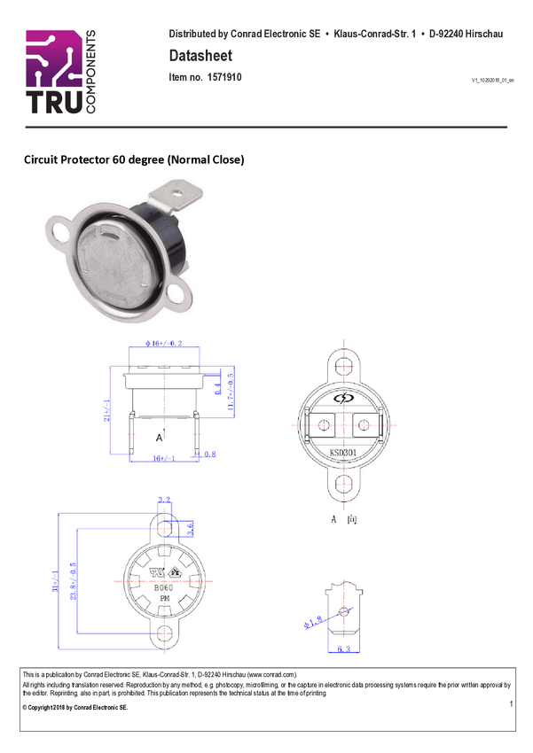 Przełącznik bimetalowy TRU COMPONENTS Temp. otwarcia ± 5°C 60 °C Temperatura zamykania 50 °C