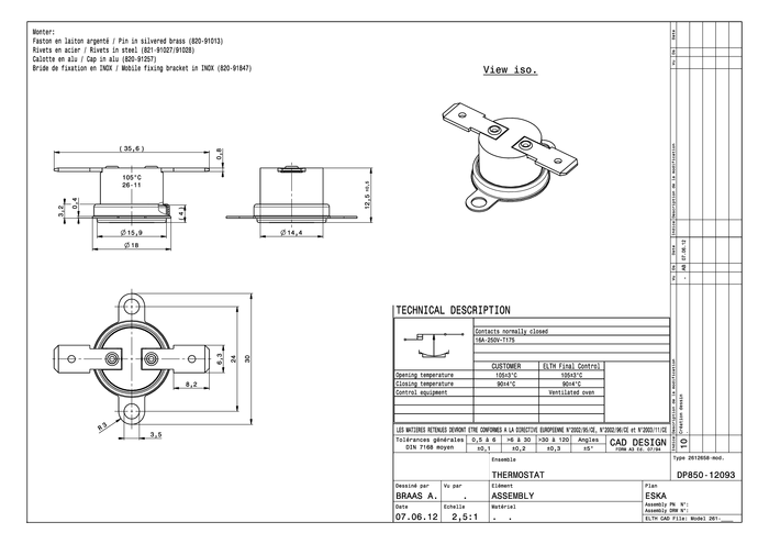 Wyłącznik termiczny bimetalowy ESKA 261-O100-S85-V, 250V 10A O:100°C C:85°C