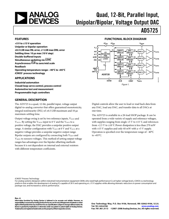 AD5725: Quad, 12-Bit, Parallel Input, Unipolar/Bipolar, Voltage Output DAC