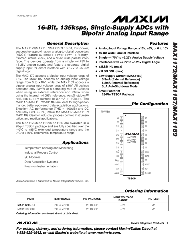 MAX1179, MAX1187, MAX1189 16-Bit, 135ksps, Single-Supply ADCs with Bipolar Analog Input Range