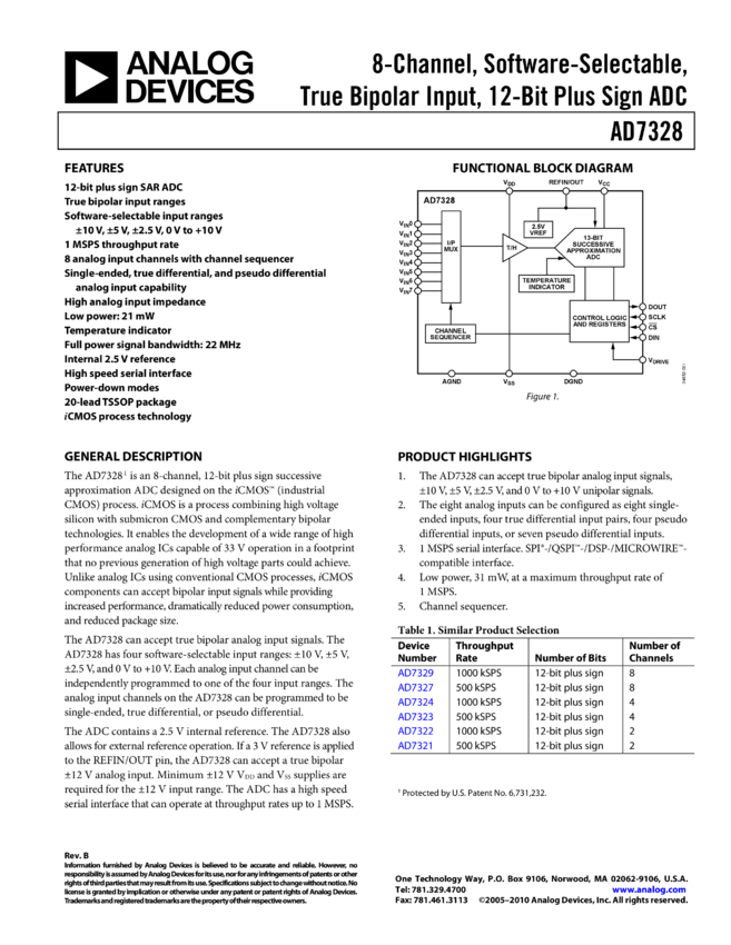 AD7328: Software Selectable, True Bipolar Input, 8-Channel, 12-Bit Plus Sign A/D Converter