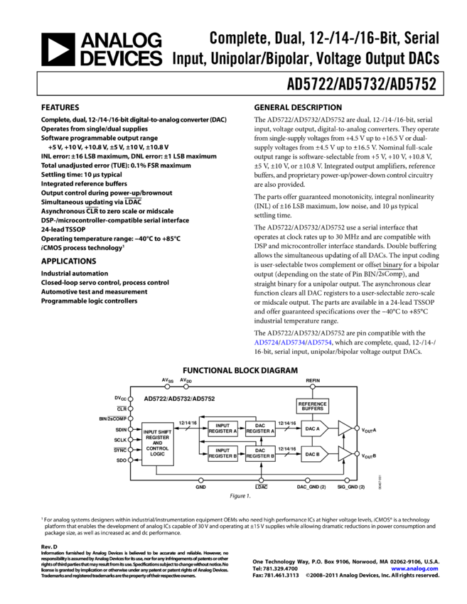 AD5752: Complete, Dual, 16-Bit, Serial Input, Unipolar/Bipolar, Voltage Output DAC