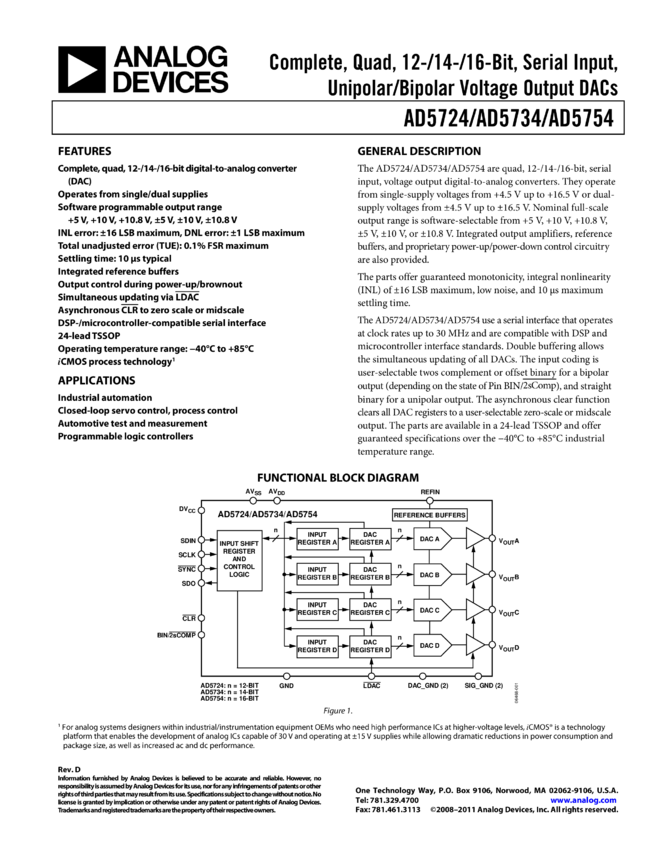 AD5734: Complete, Quad, 14-Bit, Serial Input, Unipolar/Bipolar Voltage Output DAC