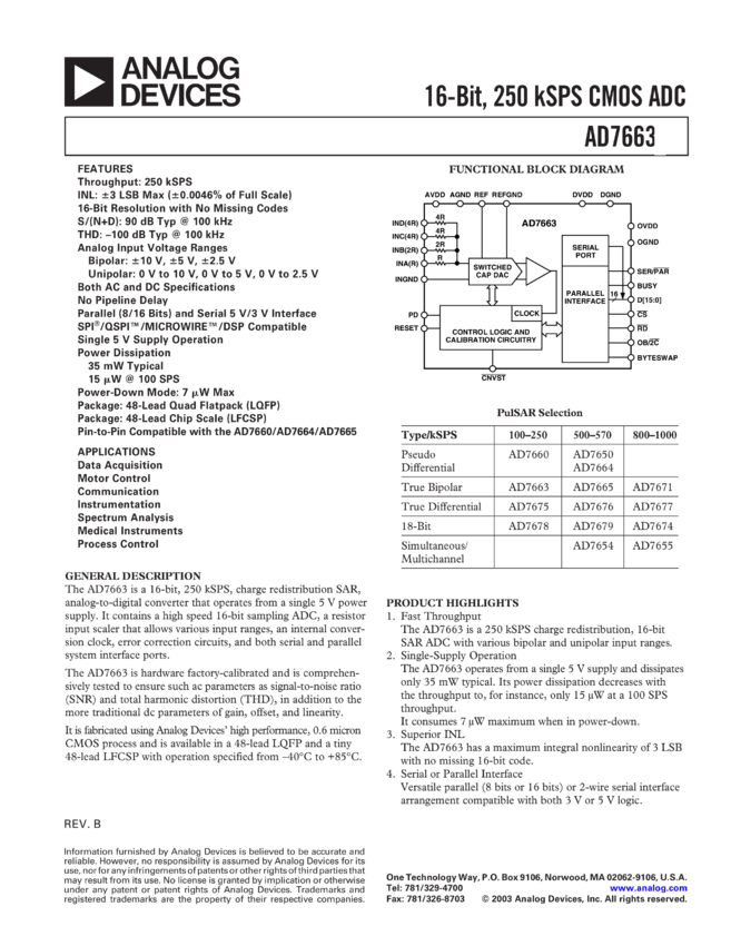 AD7663: 16-Bit Bipolar 250 kSPS PulSAR® CMOS ADC