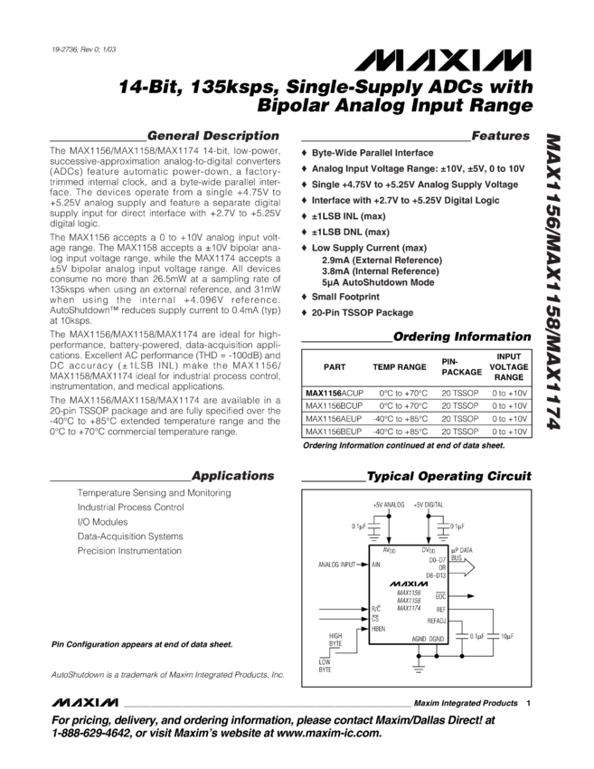 MAX1156, MAX1158, MAX1174 14-Bit, 135ksps, Single-Supply ADCs with Bipolar Analog Input Range