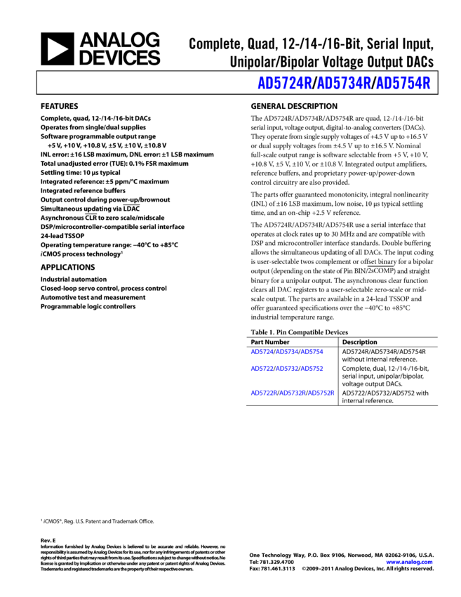 AD5754R: Complete, Quad, 16-Bit, Serial Input, Unipolar/Bipolar Voltage Output DAC