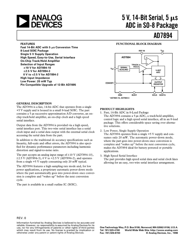 AD7894: True Bipolar Input, 5 V Single Supply, 14-Bit, Serial 4.5 s ADC in 8-Pin Package