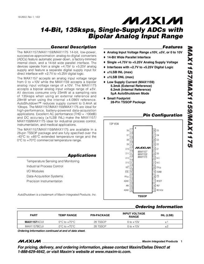 MAX1157, MAX1159, MAX1175 14-Bit, 135ksps, Single-Supply ADCs with Bipolar Analog Input Range