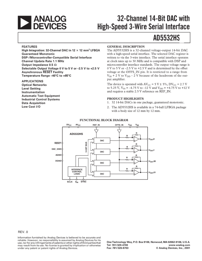 AD5532HS: 32-Channel 14-Bit bipolar DAC with High Speed 3-Wire Serial Interface
