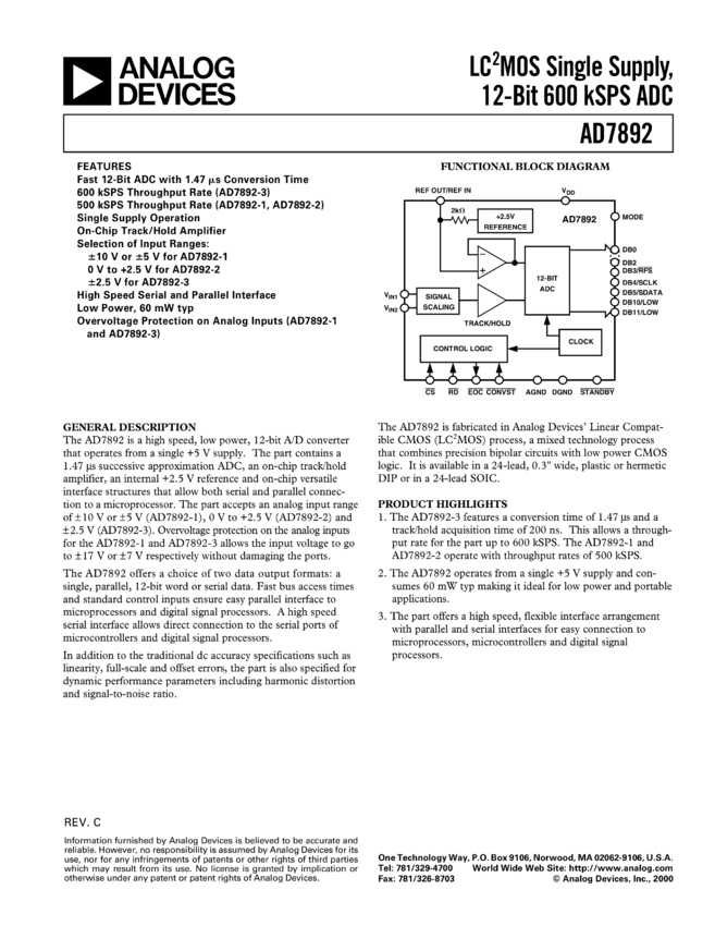 AD7892: True Bipolar Input, Single Supply, Parallel, 12-Bit 600 kSPS ADC
