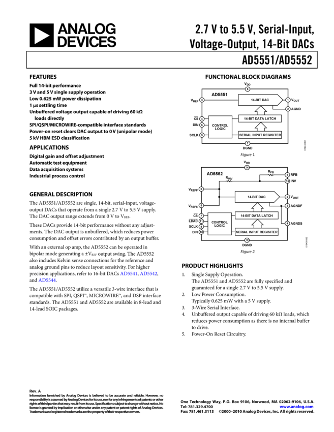 AD5552: 5 V, Serial-Input, Voltage-Output 14-Bit DAC With Bipolar Output Capability