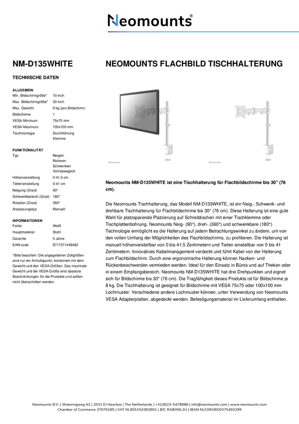 NM-D135WHITE Neomounts firmy Newstar uchwyt biurkowy do płaskiego ekranu