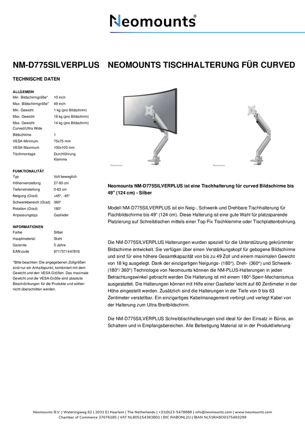 NM-D775SILVERPLUS Neomounts firmy Newstar uchwyt biurkowy z zakrzywionym ekranem