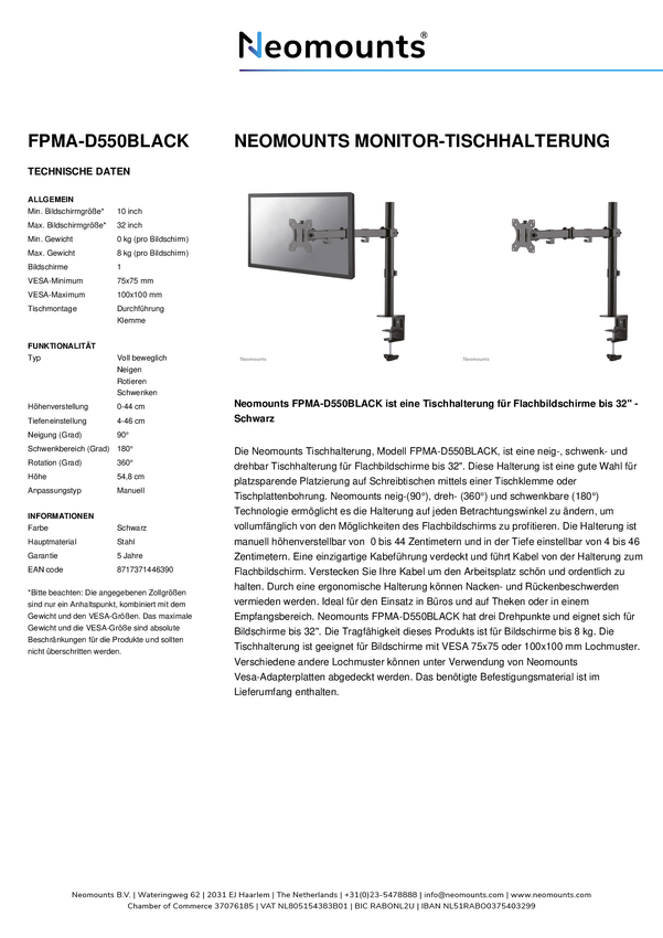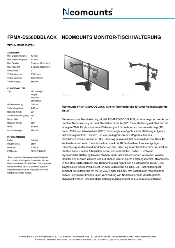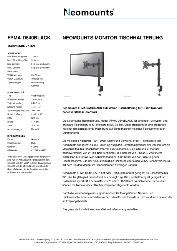 Neomounts by Newstar FPMA-D540BLACK W pełni ruchomy uchwyt biurkowy do monitorów 10-32, z regulacją wysokości - czarny