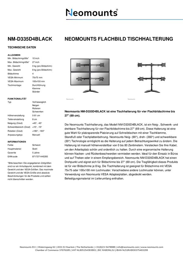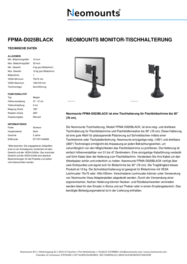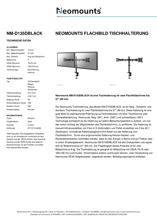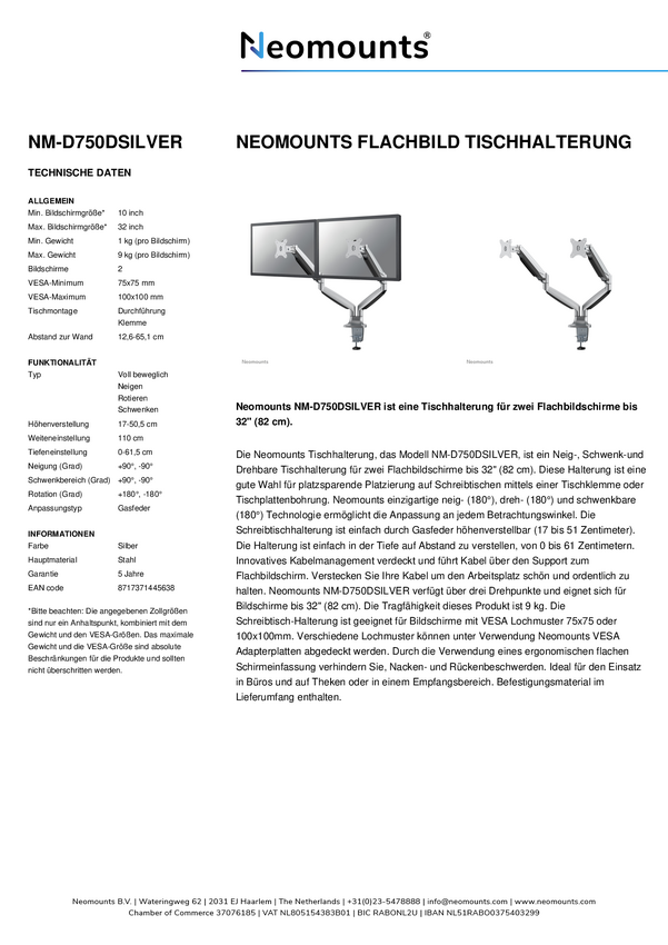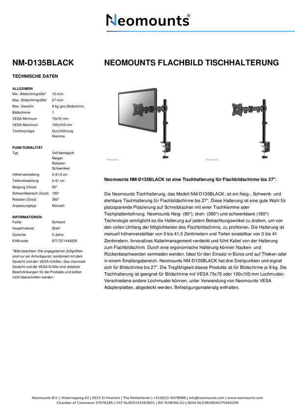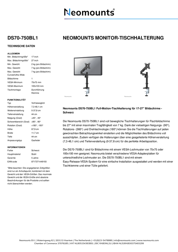 Neomounts by Newstar DS70-750BL1 W pełni ruchomy uchwyt biurkowy na 17-27 ekranów - czarny