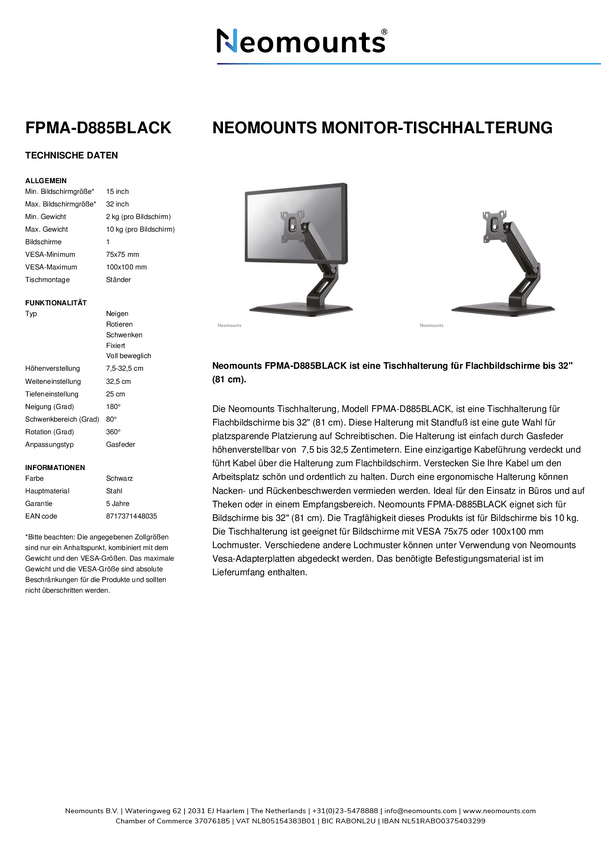 FPMA-D885BLACK Neomounts firmy Newstar uchwyt biurkowy do płaskiego ekranu
