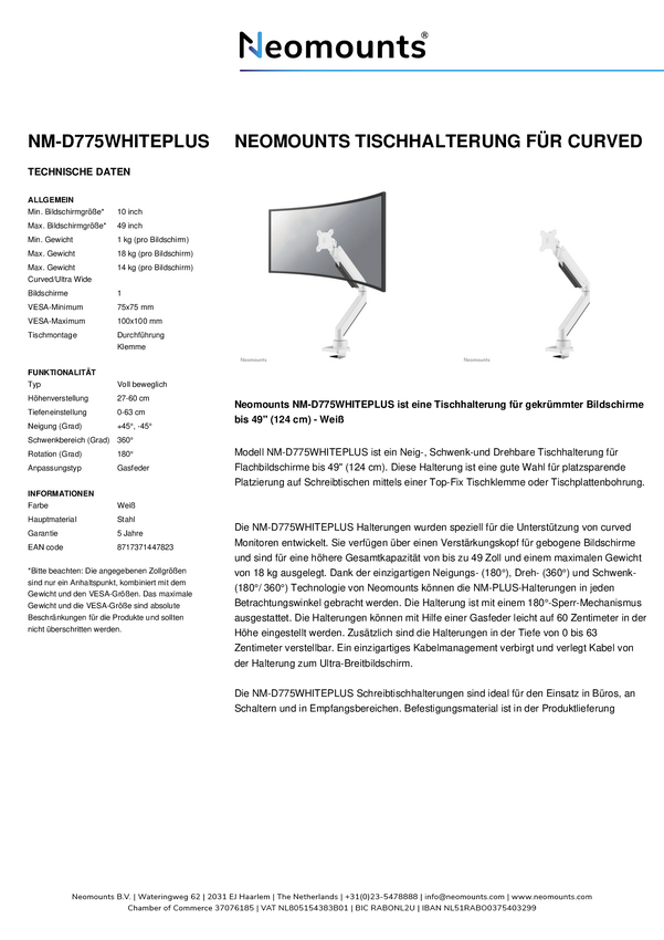 NM-D775WHITEPLUS Neomounts firmy Newstar uchwyt biurkowy z zakrzywionym ekranem