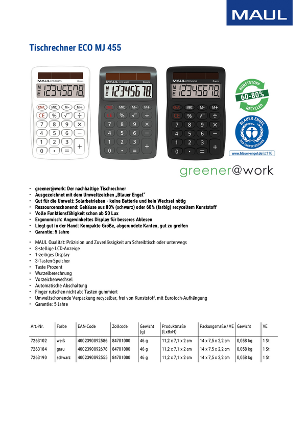 Kalkulator biurkowy MAUL ECO MJ 455 8 cyfr, kolor biały