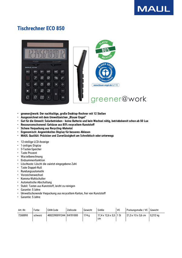 Kalkulator biurkowy ECO 850, 12 cyfr, czarny