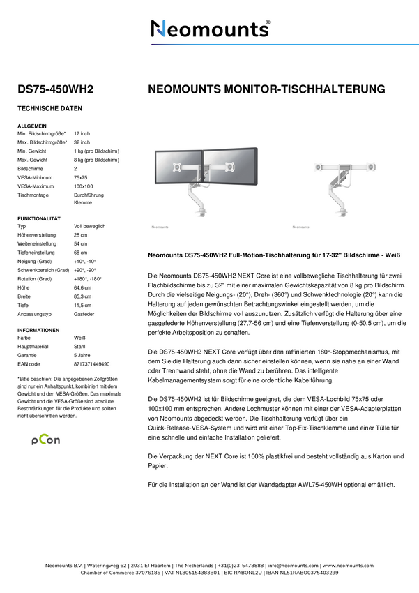 Neomounts by Newstar DS75-450WH2 uchwyt biurkowy do monitora