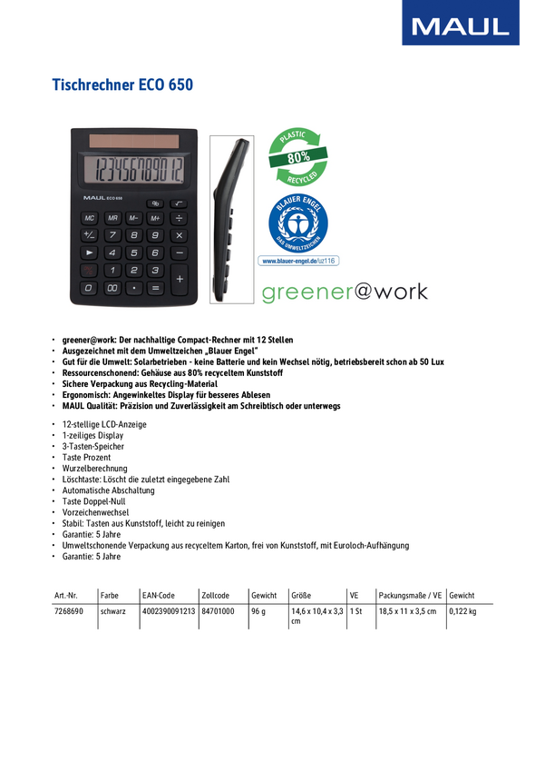 Kalkulator biurkowy ECO 650, 12 cyfr, czarny