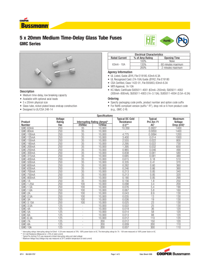Fuse Miniature 1A 250V Medium Time Delay 2-Pin Cartridge Holder Poly Bag