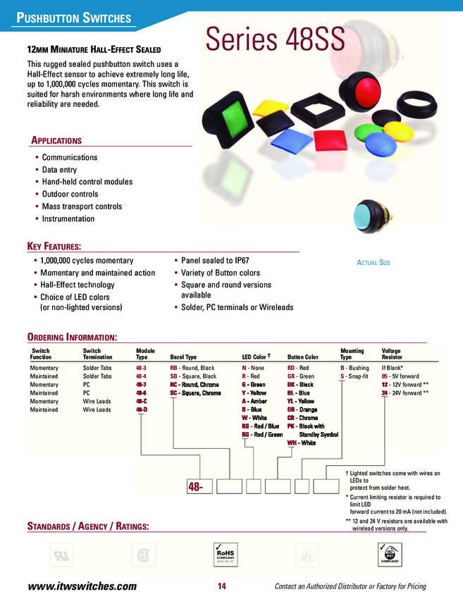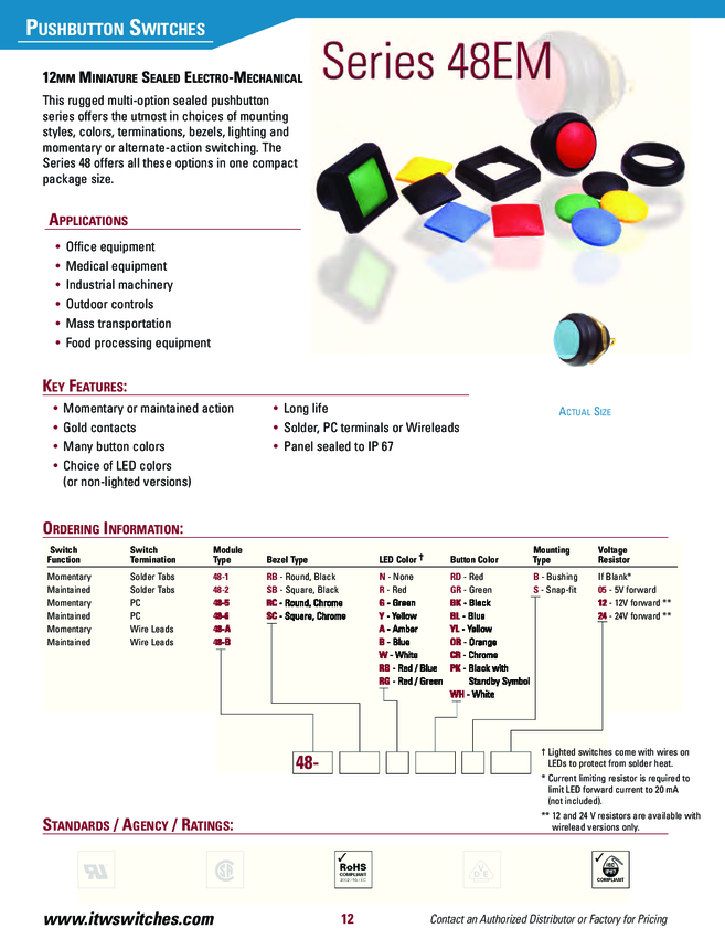 Switch Push Button N.O. SPST Round Curved Button 0.25A 48VDC Maintained Contact PC Pins Panel Mount/Through Hole
