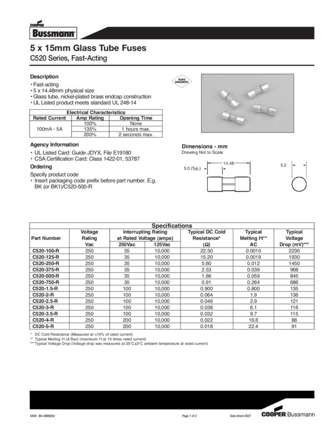 Fuse Miniature 0.63A 250V Fast 2-Pin Cartridge Holder Carton