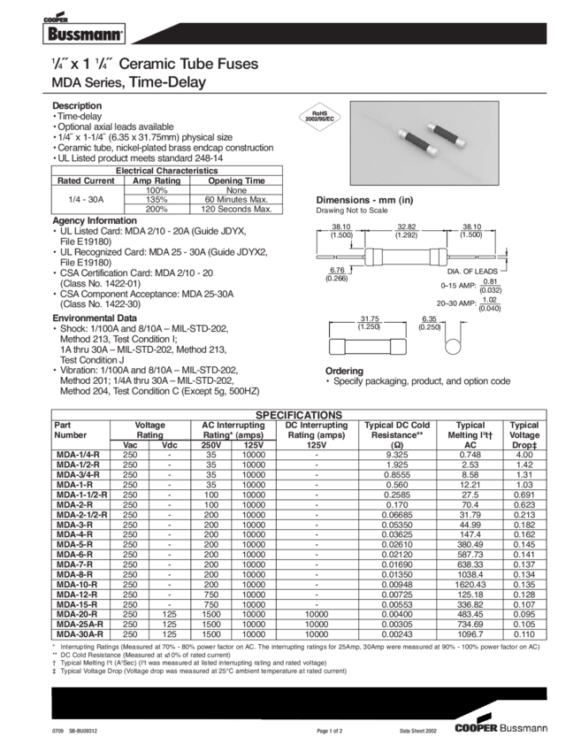 Fuse Miniature 25A 250V Slow Blow 2-Pin Cartridge Holder Cardboard Carton