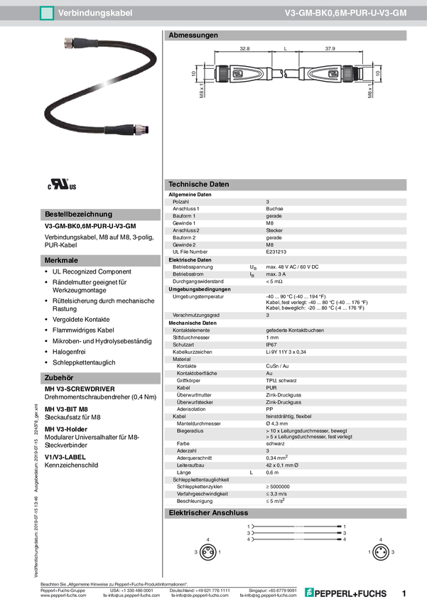 Złącze czujnika/aktuatora Pepperl+Fuchs V3-GM-BK0,6M-PUR-U-V3-GM 224378, piny: 3, 0.60 m, 1 szt.