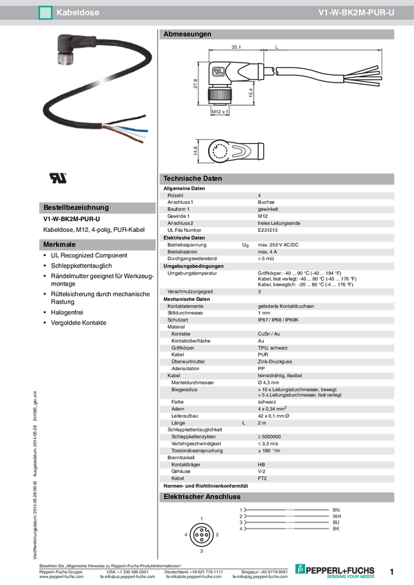 Pepperl+Fuchs 241085 Gniazdo kablowe V1-W-BK2M-PUR-U, piny: 4, 2.00 m, 1 szt.