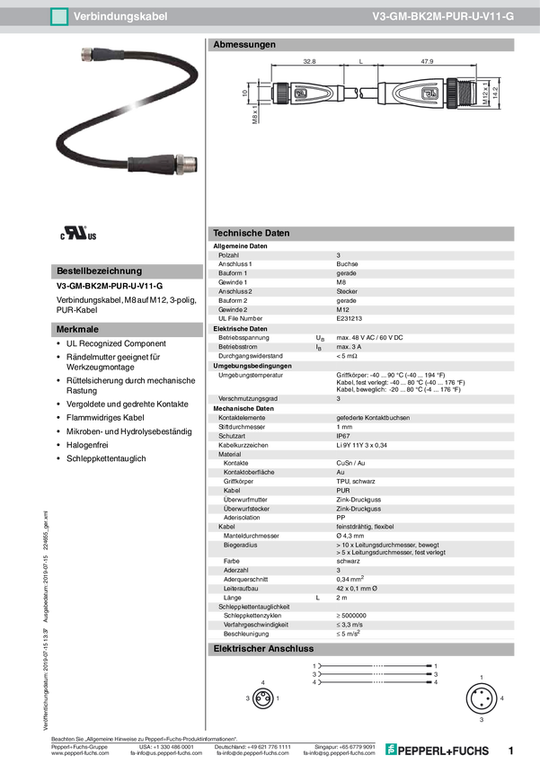 Pepperl+Fuchs 224380 Gniazdo kablowe V3-WM-BK2M-PUR-U-V3-GM, piny: 3, 2.00 m, 1 szt.