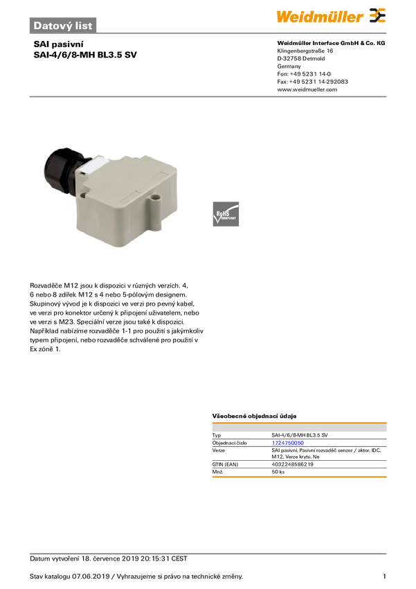 Rozdzielacz czujnik / element wykonawczy, pasywny Weidmüller SAI-4/6/8-MH BL3.5 SV 1724750050 50 szt.