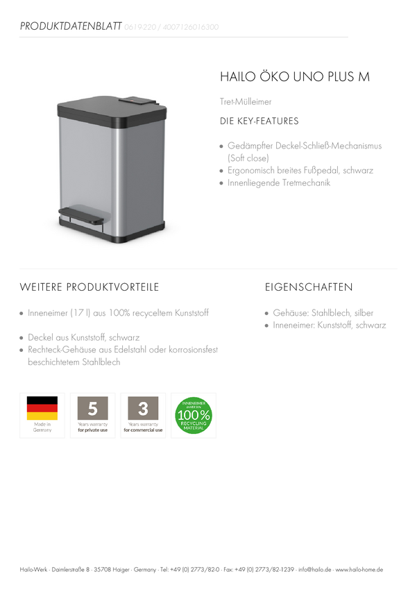 Hailo Öko uno plus M 6192200 Kosz na śmieci 17 l blacha stalowa (S x W x G) 320 x 430 x 340 mm jasnoszary Mechanizm z pe