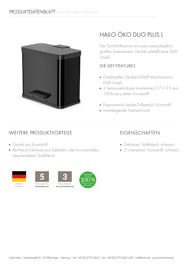 Hailo öko duo plus L 6302600 Kosz na śmieci 26 l blacha stalowa (S x W x G) 470 x 430 x 340 mm czarny Mechanizm z pedałe