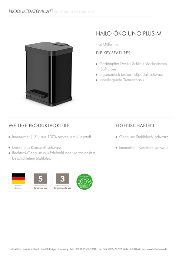Hailo Öko uno plus M 6192600 Kosz na śmieci 17 l blacha stalowa (S x W x G) 320 x 430 x 340 mm czarny Mechanizm z pedałe
