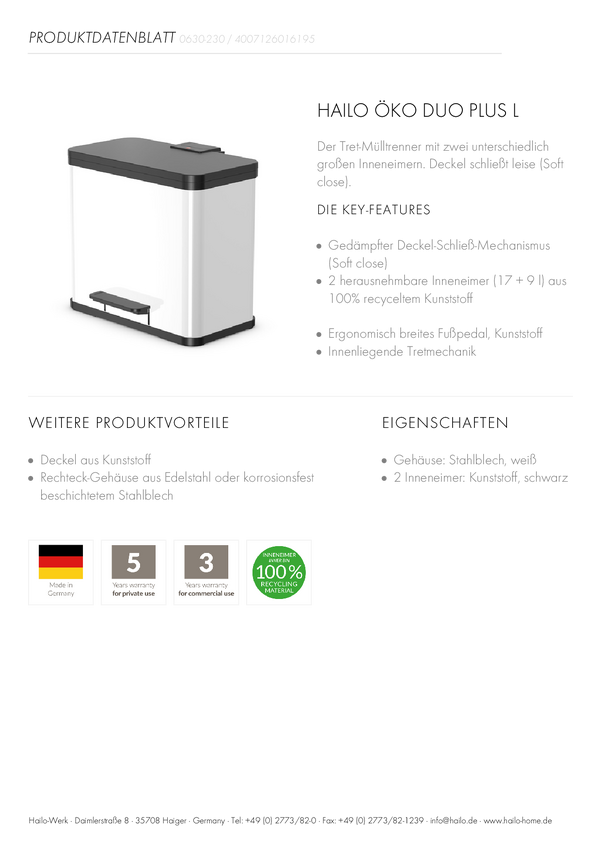 Hailo öko duo plus L 6302300 Kosz na śmieci 26 l blacha stalowa (D x S x W) 34 cm x 470 mm x 430 mm biały Mechanizm z pe
